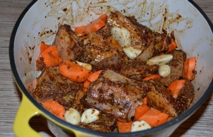 4На следующий день к мясу добавляем нарезанную крупно морковь, а также очищенный чеснок, разделенный на зубчики.