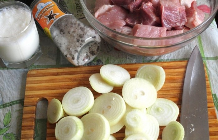 1Подготавливаем необходимые ингредиенты. Свинину промываем тщательно и обсушиваем, а лук нарезаем кольцами.