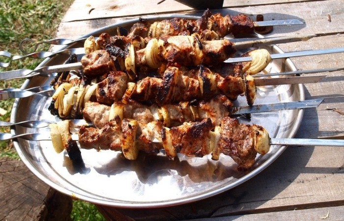 3На следующий день едем на природу и нанизываем мясо с луком на шампуры.