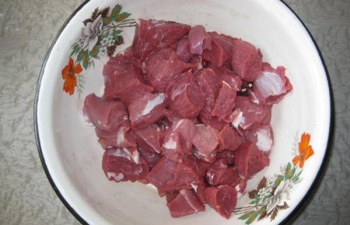 2Ногу очищаем от жилок и жира (жир нам еще понадобится). Мясо нарезаем небольшими кубиками.