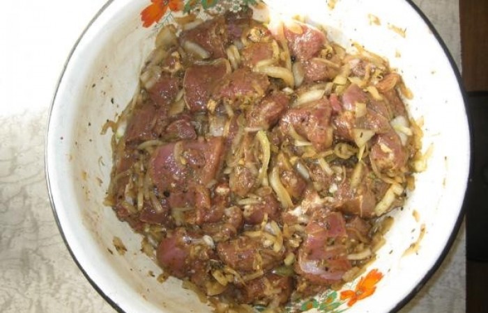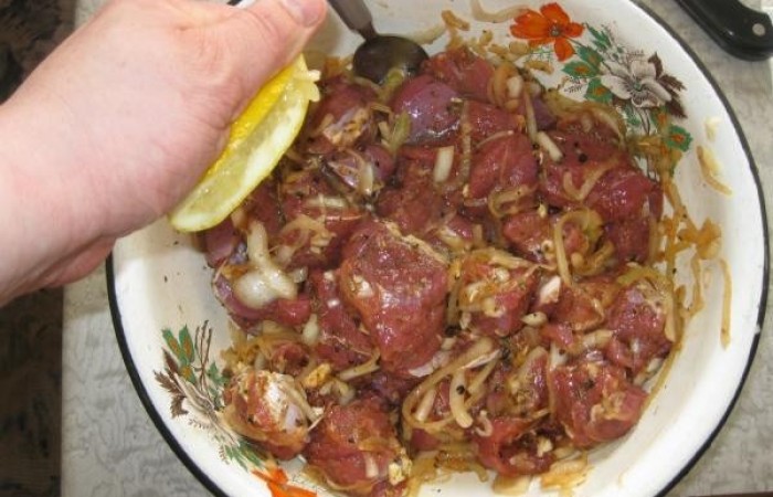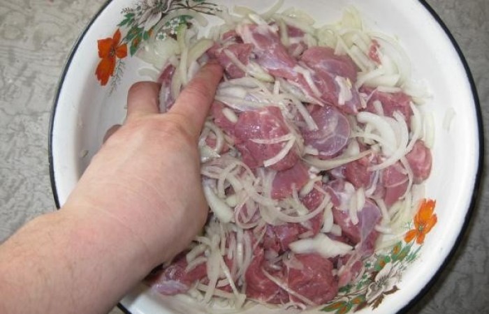 8Тщательно все перемешиваем, накрываем емкость крышкой и ставим какой-нибудь груз. Отправляем шашлык мариноваться в холодильник на 4 часа.