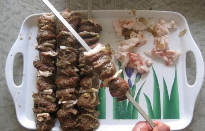 9Нанизываем мясо на шампуры, чередуя с жиром.