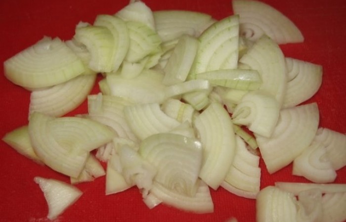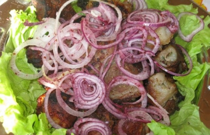 6Красный лук нарезаем кольцами и смешиваем с сумахом.