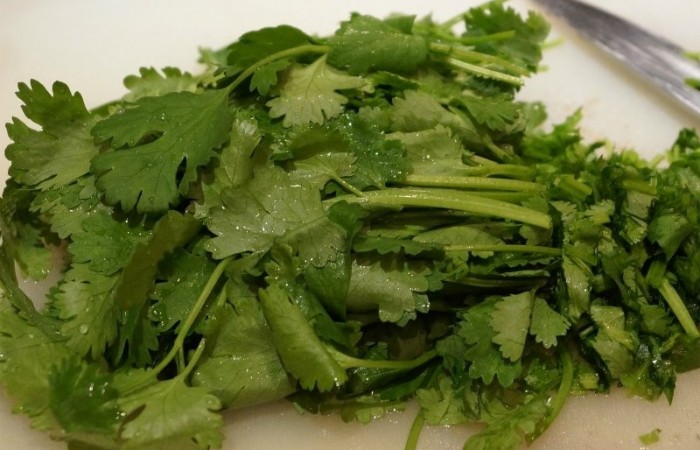 1Кинзу тщательно промываем и мелко нарезаем. Выкладываем в глубокую емкость.