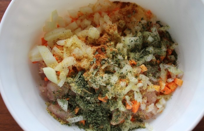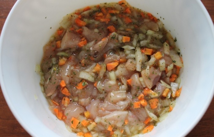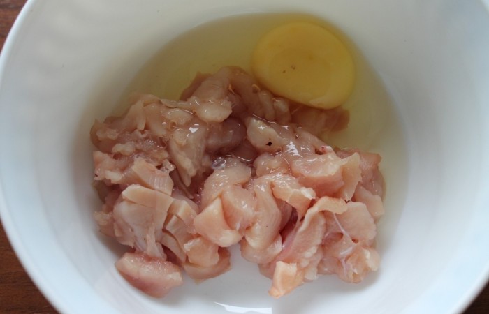 1Грудку разделываем, удаляем косточки и кожу. Рубим на мелкие кусочки.