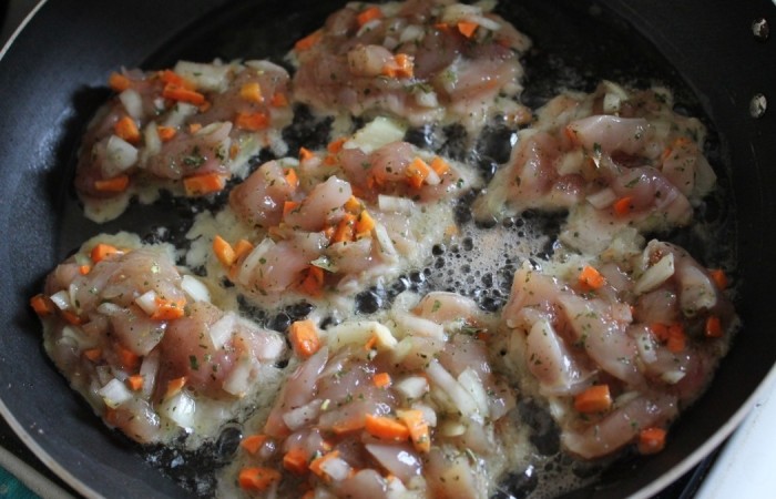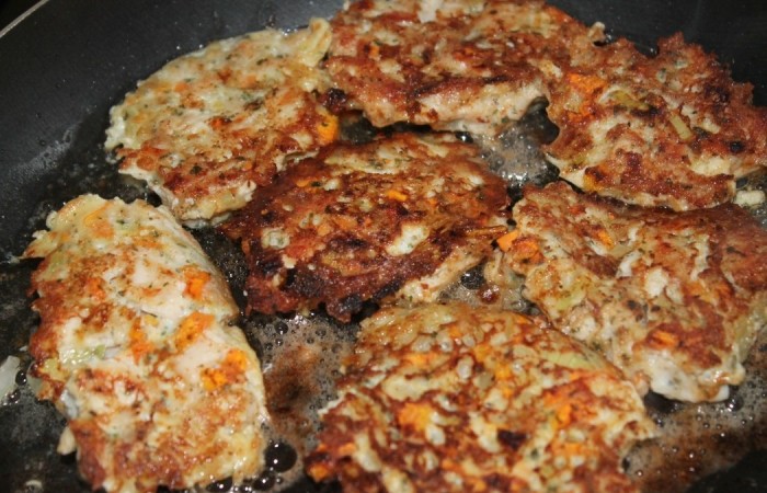 7С помощью столовой ложки выкладываем куриную массу на сковороду. Обжариваем с одной стороны в течение 5 минут на среднем огне.