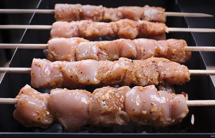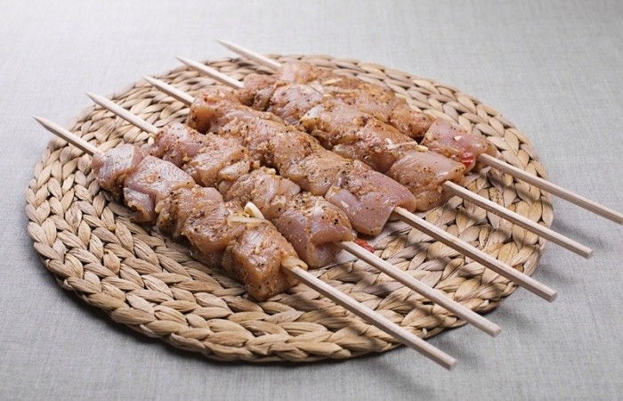 5Курицу нанизываем на шампуры или деревянные шпажки, предварительно замоченные в холодной воде.