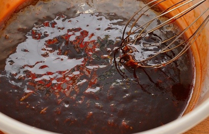 2Готовим маринад. Смешиваем соевый соус, кетчуп, апельсиновый сок, тертый имбирь и сахар. Количество сахара регулируем по своему вкусу.