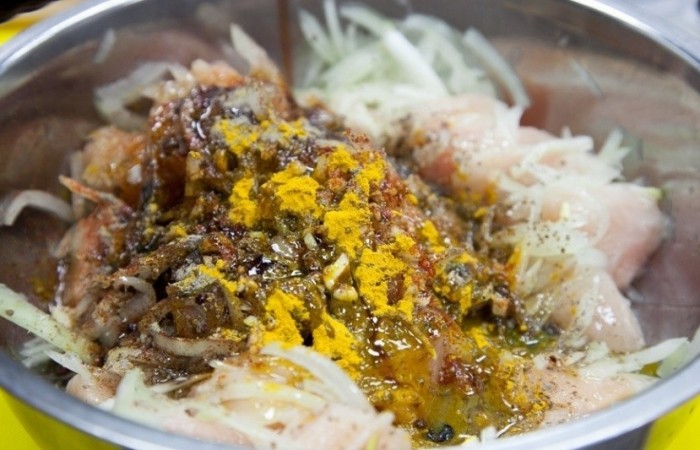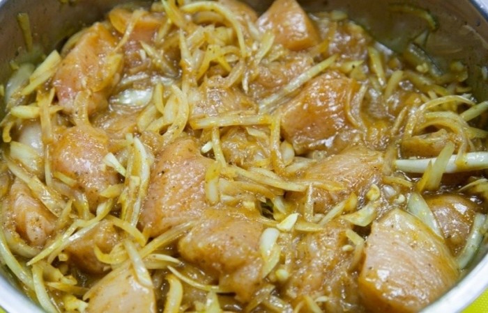 1Грудку промываем, обсушиваем и нарезаем небольшими порционными кусочками и выкладываем в глубокую емкость. Добавляем нарезанный полосочками лук. Добавляем пропущенный через пресс чеснок, масло (50 мл), лимонный сок, соевый соус, соль, перец и специи.