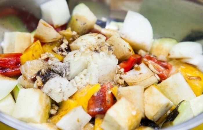 3Тем временем овощи нарезаем порционными небольшими кубиками. Солим, перчим, добавляем специи, соевый соус и масло. Тщательно все перемешиваем.