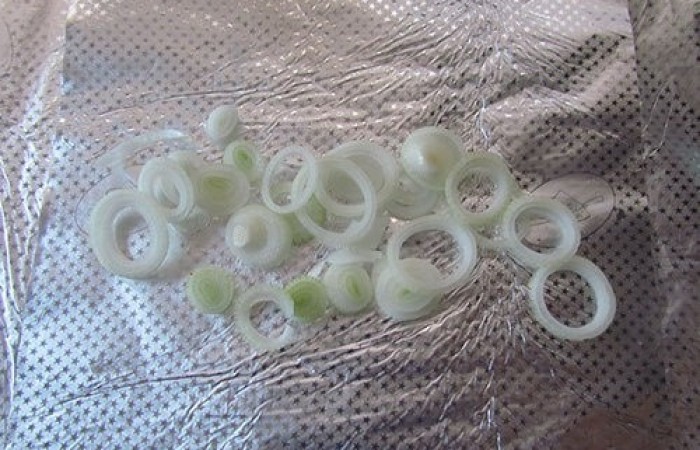 2Лук нарезаем кольцами и выкладываем на фольгу.