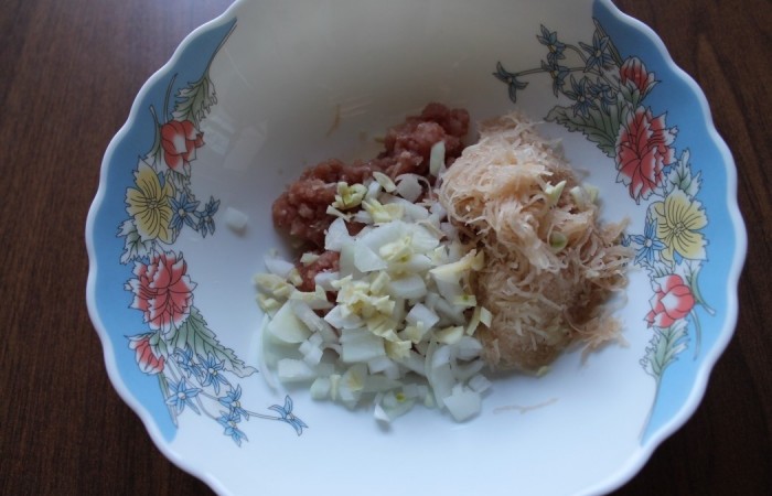 1Филе мелко нарезаем или пропускаем через мясорубку. Добавляем мелко нарезанный лук.