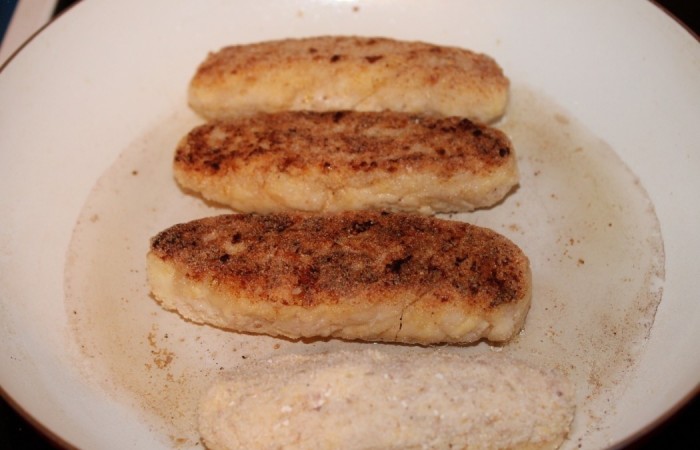 7Из рыбной массы формируем котлеты желаемой величины и обваливаем их в панировочных сухарях.
