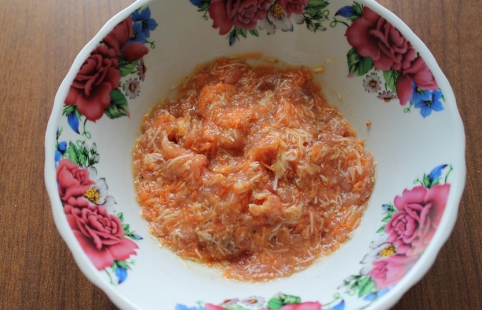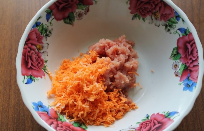 1Рыбное филе пропускаем через мясорубку или мелко нарезаем. Добавляем к нему тертую на мелкой терке морковь.
