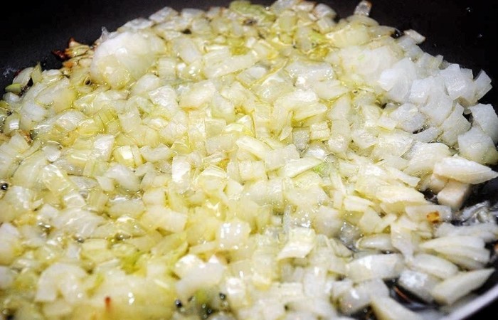 2Лук нарезаем мелкими кубиками и обжариваем в течение 6-7 минут.