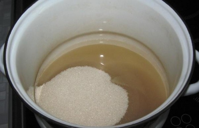 4В кастрюлю наливаем воду и добавляем сахар (50 г сахара оставляем).