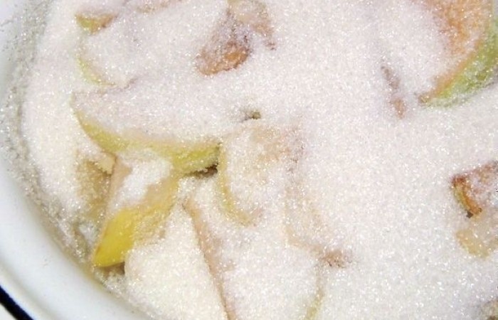 3Выкладываем яблоки в глубокую емкость слоями, пересыпая сахаром. Оставляем яблоки в покое на 2-3 часа, чтобы они пустили сок.