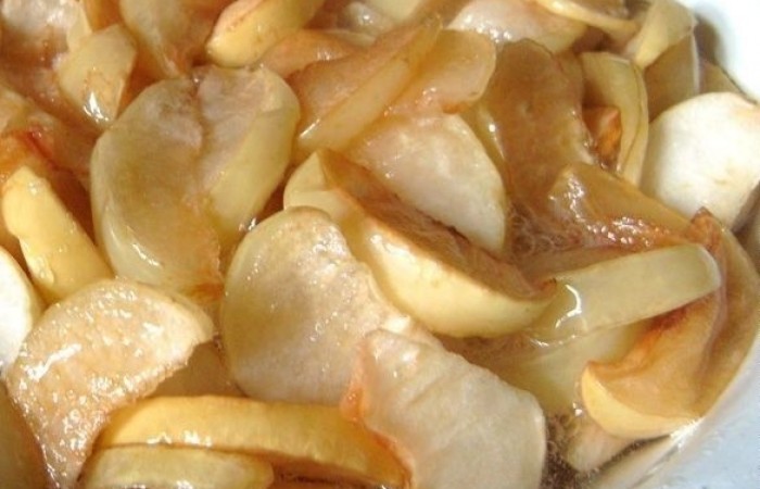 2Яблоки нарезаем тонкими дольками, предварительно удалив сердцевину. Выкладываем яблоки в соленую воду (1 ч.л. соли на литр воды). Это нужно нам для того, что пока мы не нарежем все яблоки, предыдущие бы не потемнели. Промываем яблоки под холодной проточной водой и перекладываем в содовый раствор (2 ч.л. соды на литр воды) на 5 минут. Это нужно нам для того, чтобы яблоки в дальнейшем не разварились. Промываем яблоки.