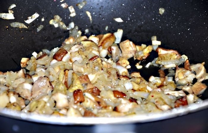 2Грибы нарезаем маленькими кусочками, а лук измельчаем. Обжариваем на оливковом масле в течение 5 минут, периодически помешивая.