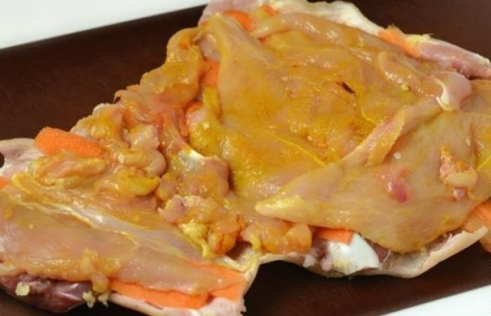 5Каждое филе не до конца разрезаем, чтобы получился пласт. Отбиваем и натираем карри. Выкладываем на морковь.