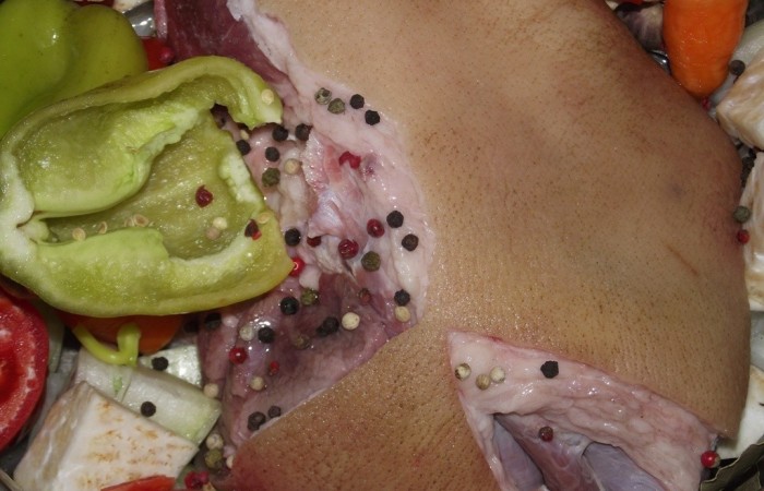 2Рульку промываем, соскабливаем шкурку и выкладываем в кастрюлю. Добавляем специи и очищенные овощи.