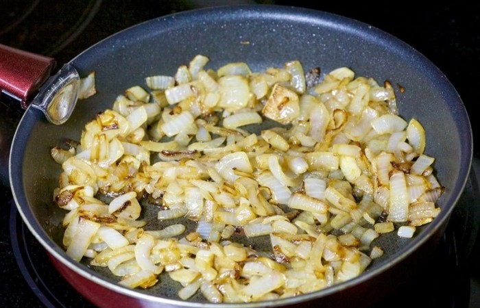 9Тем временем лук нарезаем мелкими кубиками и обжариваем на сливочном масле до золотистости.