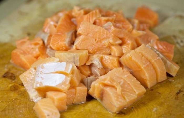 10Рыбу нарезаем небольшими кубиками.
