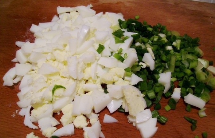 5Зеленый лук нарезаем колечками, а яйца мелкими кубиками.