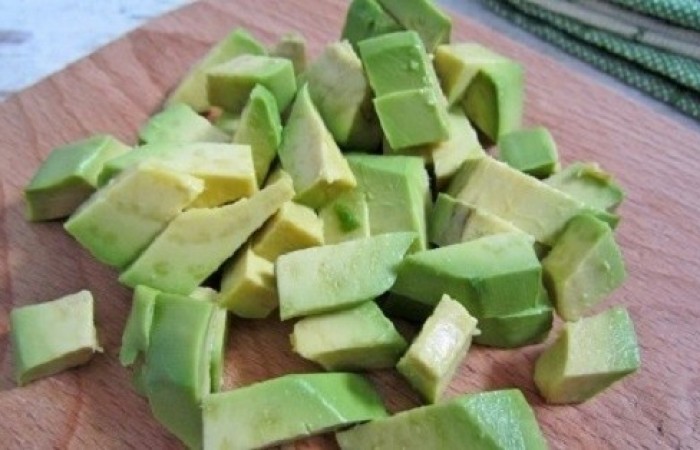 3Авокадо очищаем от кожуры, удаляем косточку и нарезаем небольшими кусочками.