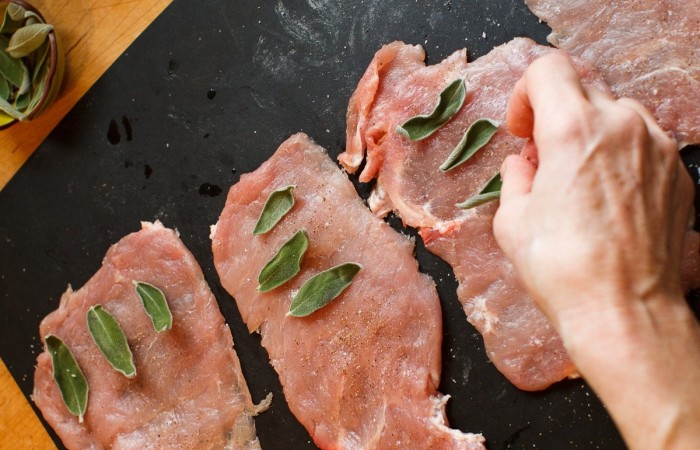 5Каждую отбивную солим, перчим и выкладываем 3 листика шалфея.