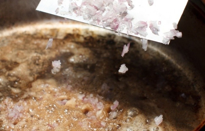 10Выкладываем отбивные, а на сковороде растапливаем еще немного сливочного масла. Выкладываем измельченный лук-шалот