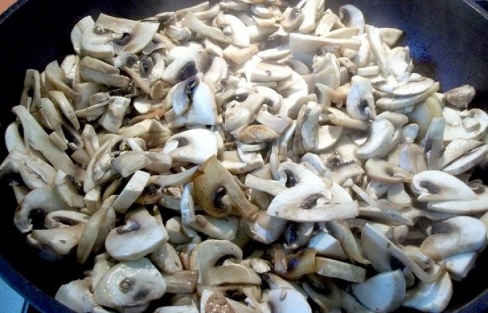 11Затем выкладываем обжаренные шампиньоны с луком.