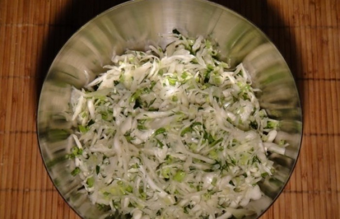 4Зелень смешиваем с капустой. Добавляем черный перец по вкусу.