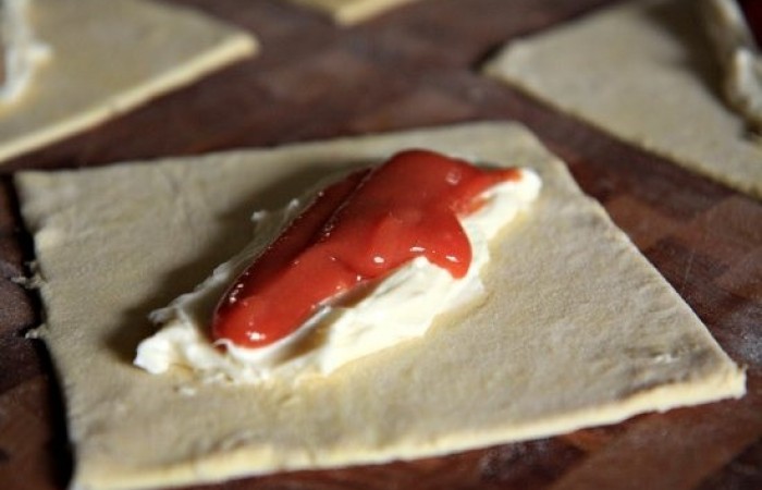 5По диагонали выкладываем на каждый квадратик сливочный сыр и сверху поливаем гуавой.