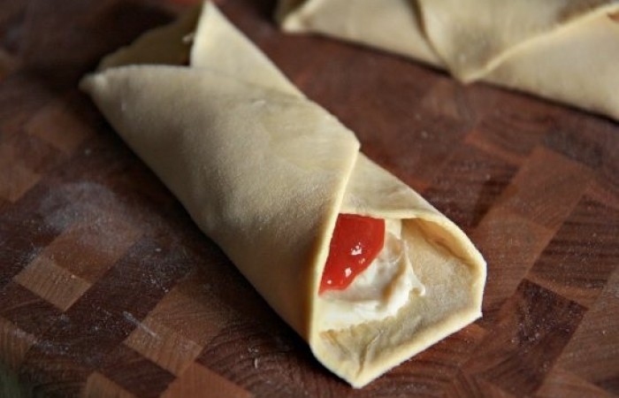 6Края квадратов смазываем водой и заворачиваем в форме буритто. Отправляем в духовку на 25 минут, предварительно разогретую до 180 градусов.
