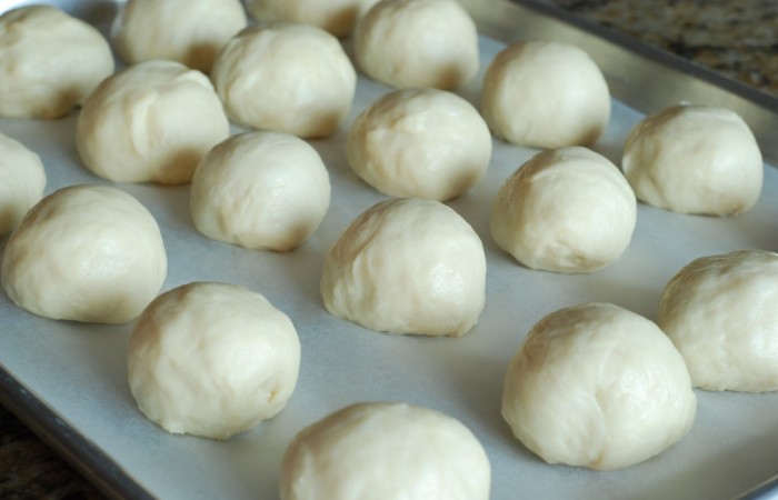 22Выкладываем булочки швом вниз на противень, застеленный пергаментом.