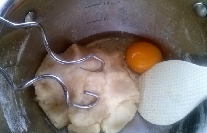 2Остужаем тесто и добавляем по очереди яйца.
