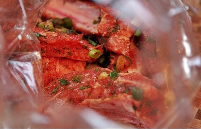 4Ребрышки натираем специями и выкладываем в рукав. Также в рукав помещаем зелень.