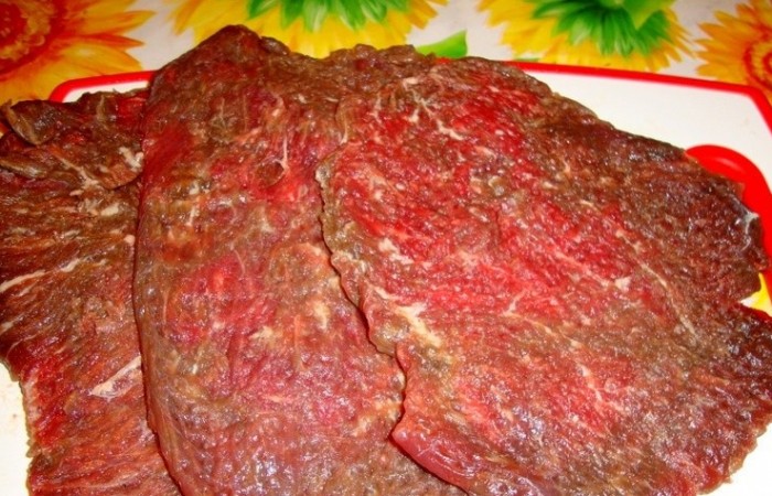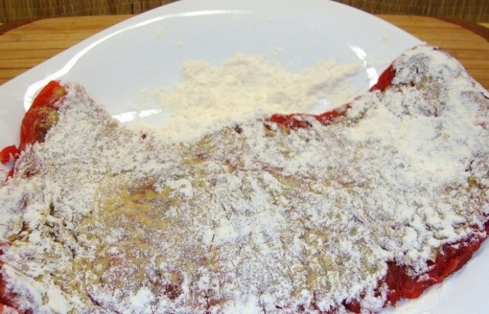 1Говядину нарезаем и тонко отбиваем под пищевой пленкой с двух сторон.