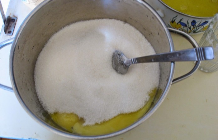 2Белки отделяем от желтков. Желтки перетираем с сахаром и добавляем их в опару.
