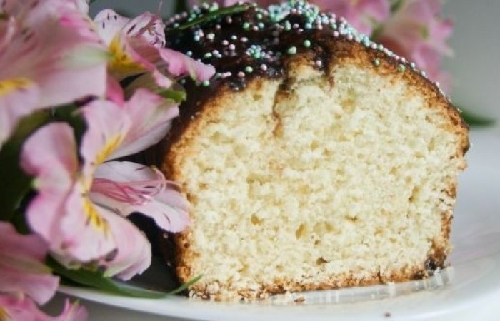 6Кекс на желтках готов. Украшаем по желанию глазурью и кондитерской посыпкой. Разрезаем и подаем к столу.