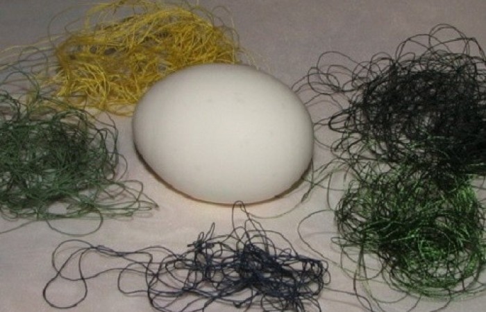 3Комочки ниток прикладываем к яйцу. Лучше использовать как можно больше ниток разных цветов для одного яйца.