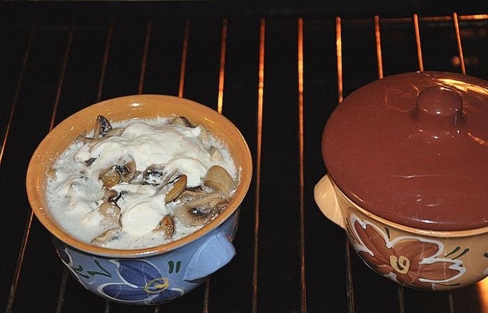 4Грибы нарезаем пластинами и обжариваем с измельченным луком. Солим, перчим. Выкладываем грибы на пельмени и поливаем соусом из сметаны, тертого сыра и хрена. Заливаем горшочки бульоном, чтобы он покрывал пельмени, и отправляем в духовку на 20 минут, предварительно разогретую до 180 градусов.