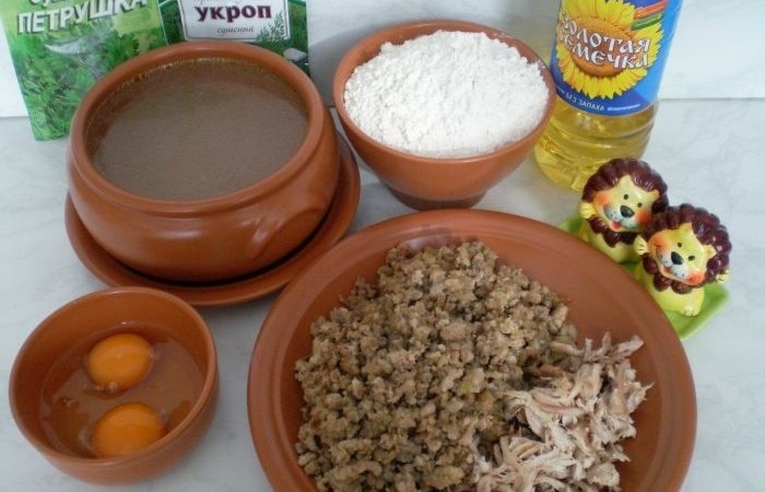 1Подготавливаем необходимые ингредиенты для блинчиков. Фарш обжариваем с измельченным луком до готовности около 10 минут, постоянно помешивая. Солим, перчим по вкусу. Грудинку отвариваем и разделяем на волокна.