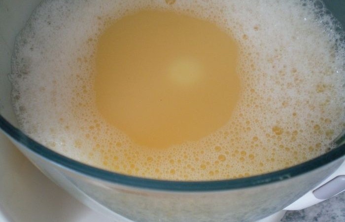 2В теплый бульон добавляем яйца и взбиваем с помощью блендера или миксера.
