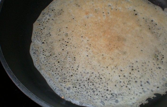 5Наливаем небольшое количества теста и обжариваем блинчики с одной стороны около 2 минут.