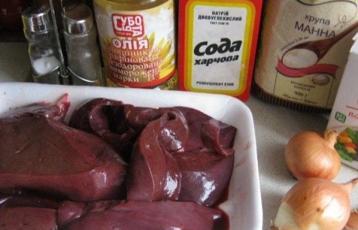2Печень промываем, обсушиваем и нарезаем небольшими кубиками. Замачиваем в молоке на полчаса.