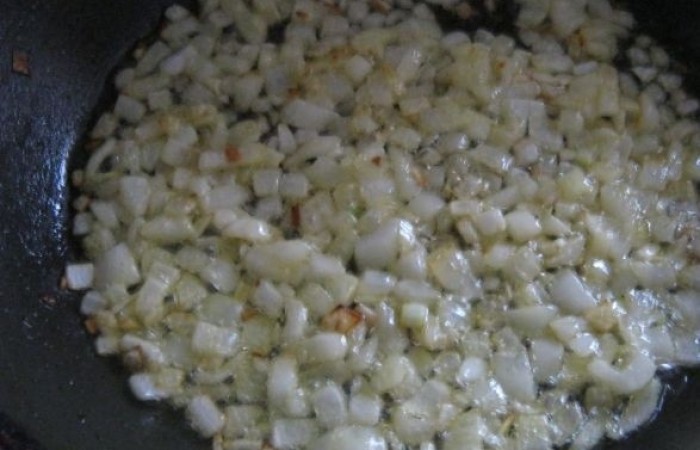 3Лук нарезаем мелкими кубиками и обжариваем на раскаленной сковороде в течение 3 минут.