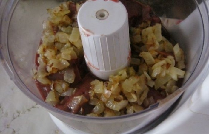 4Печень с луком выкладываем в чашу блендера и измельчаем (можно пропустить через мясорубку).