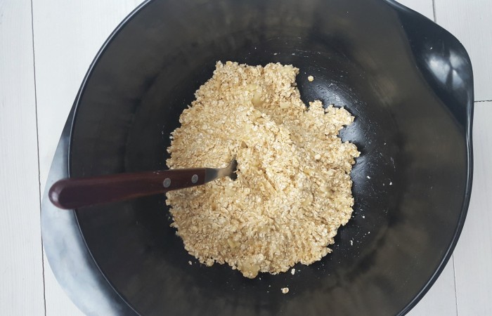 3Овсяные хлопья при необходимости измельчаем и добавляем к ним бананы.
